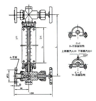 儀表上下閥都裝有PN1.6MPa,DN20的法蘭。通過焊接在容器上的法蘭,與容器組成連通器,透過玻璃管就可直接顯示容器內(nèi)介質(zhì)液位的高度。